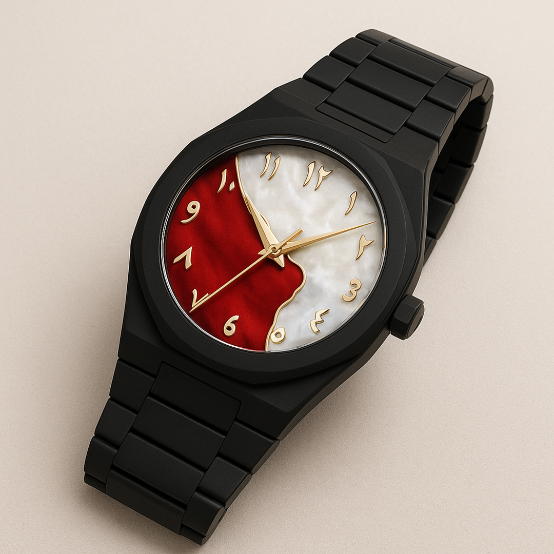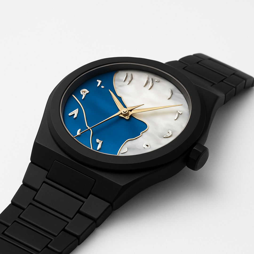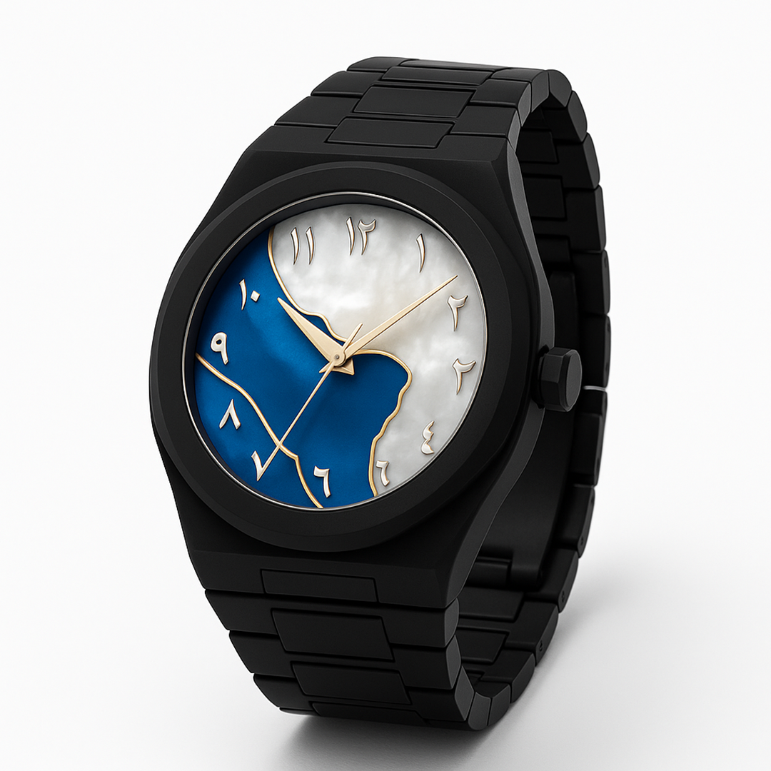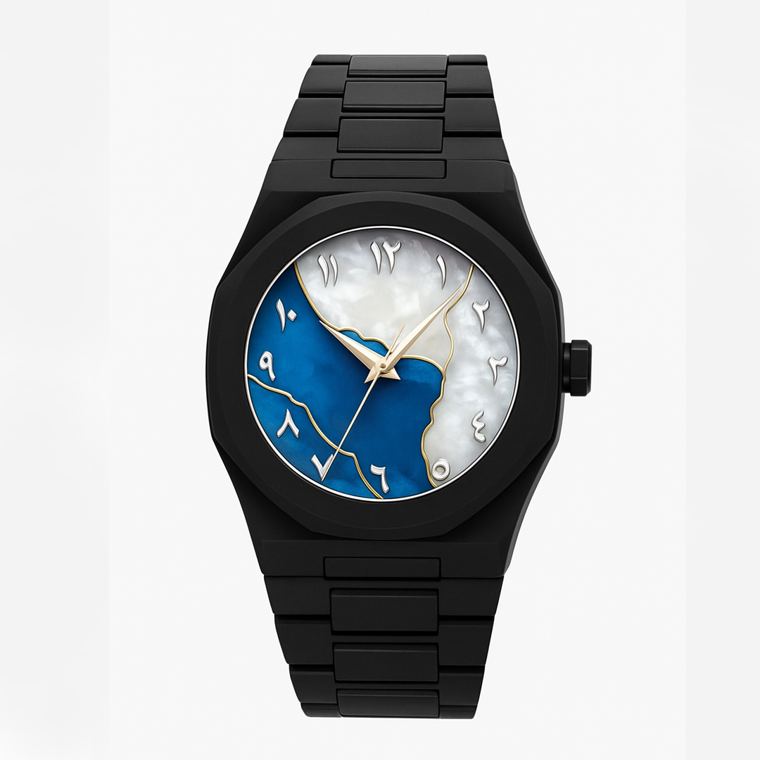Embrace contemporary elegance with this exquisite black timepiece that unites artistic expression and refined sophistication. The watch showcases a mesmerizing dial featuring a deep blue and mother-of-pearl design a seamless blend of serenity and strength. Gold Arabic numerals and sleek matching hands enhance its luxurious appeal, exuding both cultural richness and modern grace. Encased in a matte black stainless steel body with a matching bracelet, this watch embodies confidence, individuality, and timeless style perfect for those who appreciate understated luxury with a distinctive edge.