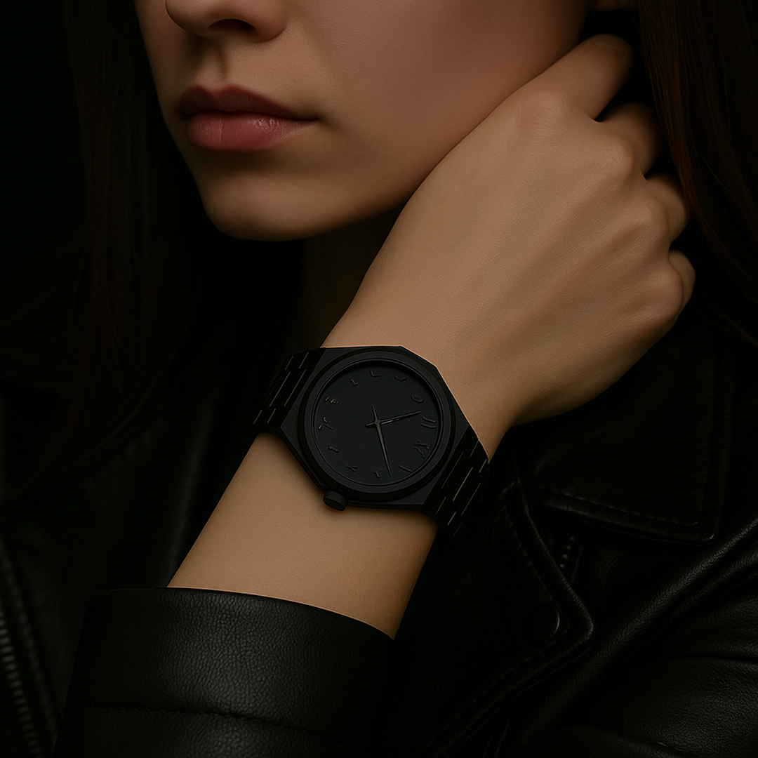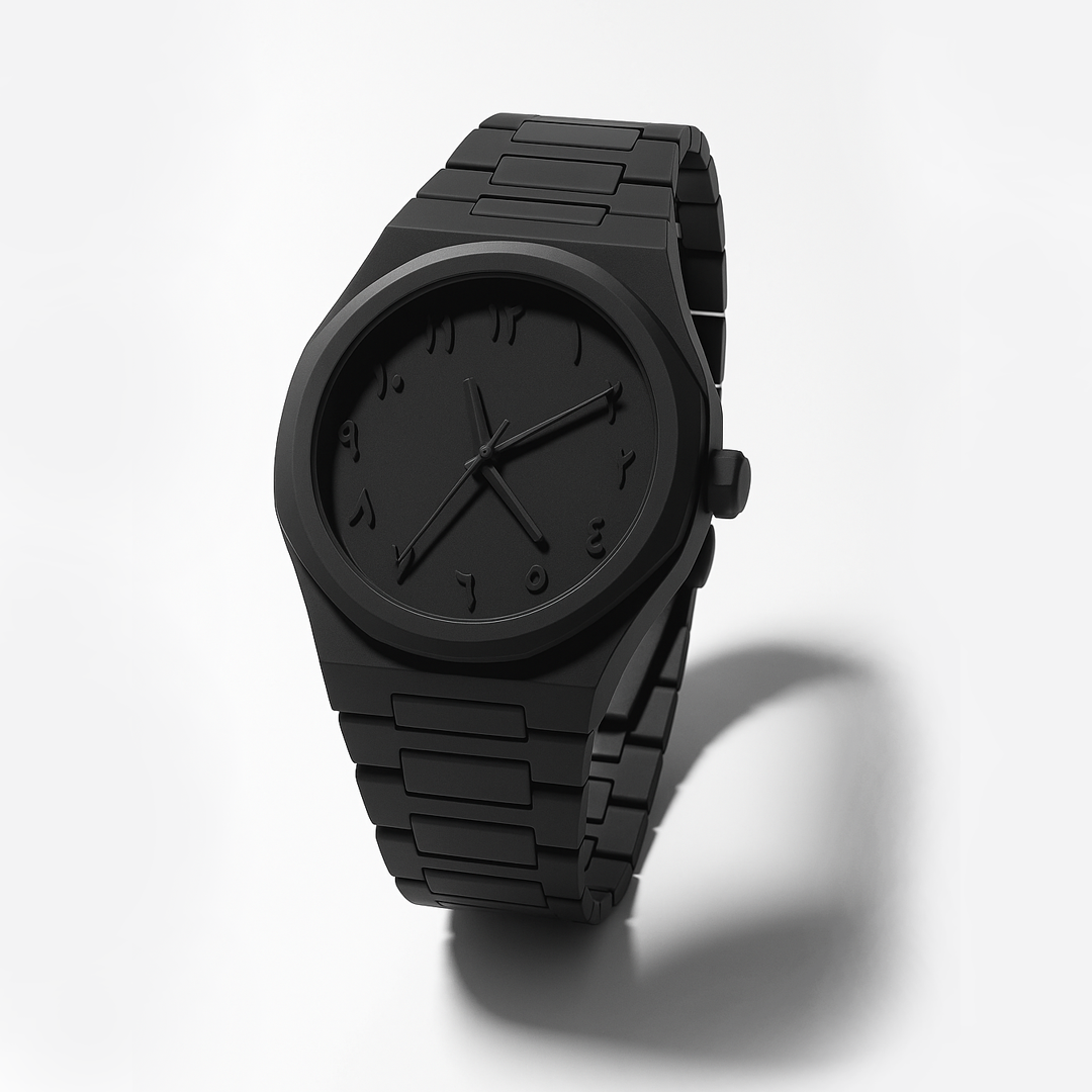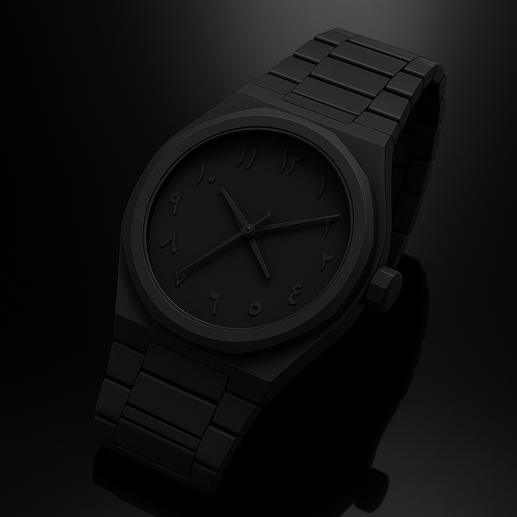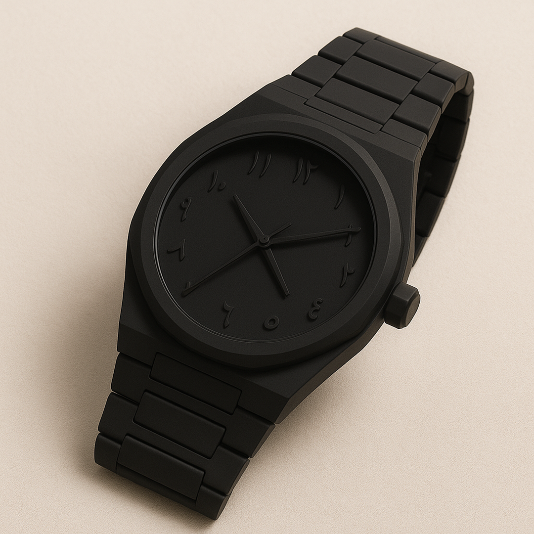 The Black Aura Original a statement in stealth. Matte all-black finish, Eastern numerals, and a sleek integrated bracelet for a bold, minimalist edge.